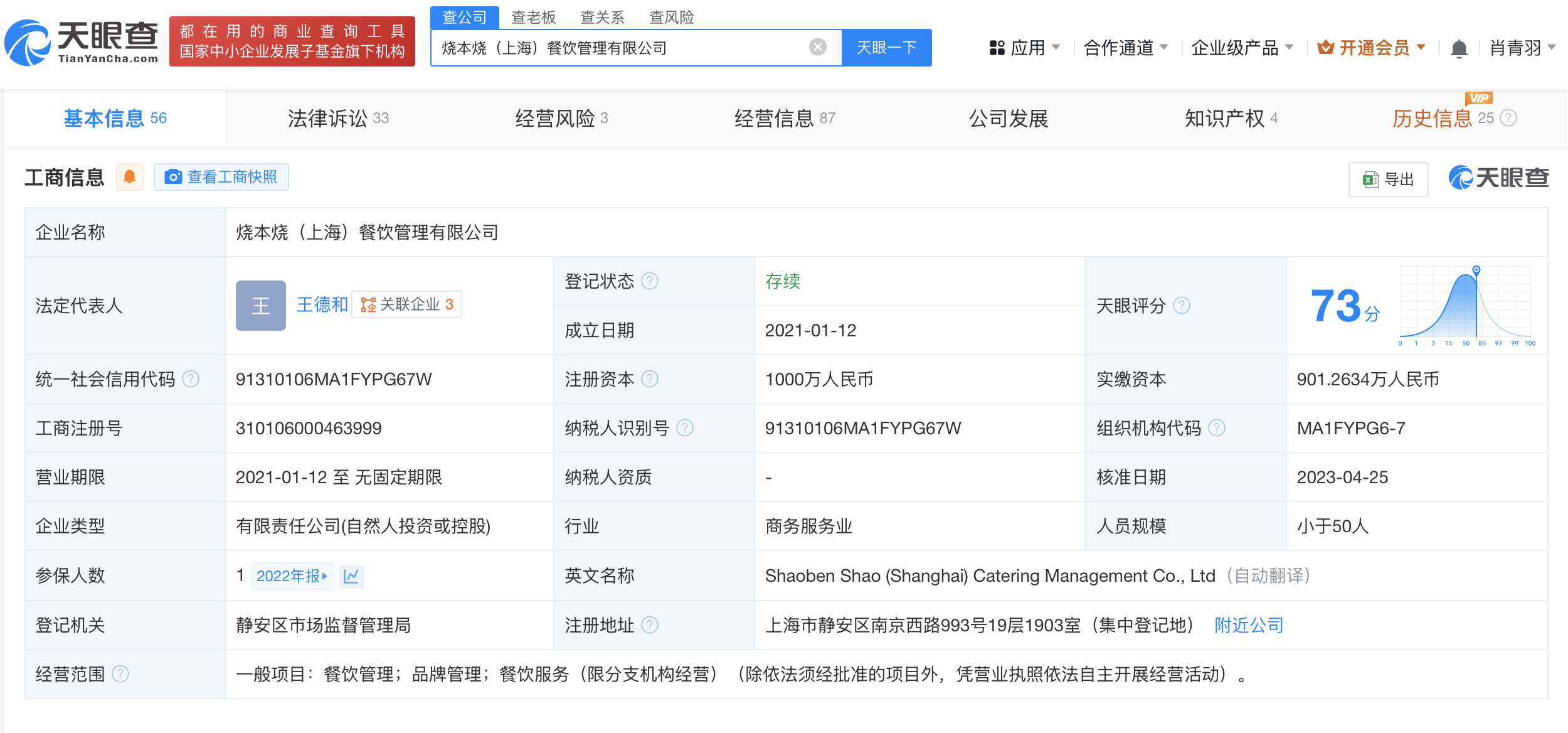 烧本烧公司已面临多重风险。据公开信息,该公司已关联到一起破产案件,申请人为南京众天下餐饮管理有限公司,该案件由上海市第三中级人民法院经办,公开日期为2024年6月。不仅如此,烧本烧公司还因税务问题被国家税务总局上海市静安区税务局列为非正常户,并在2024年7月被上海市静安区市场监督管理局列入经营异常名录。